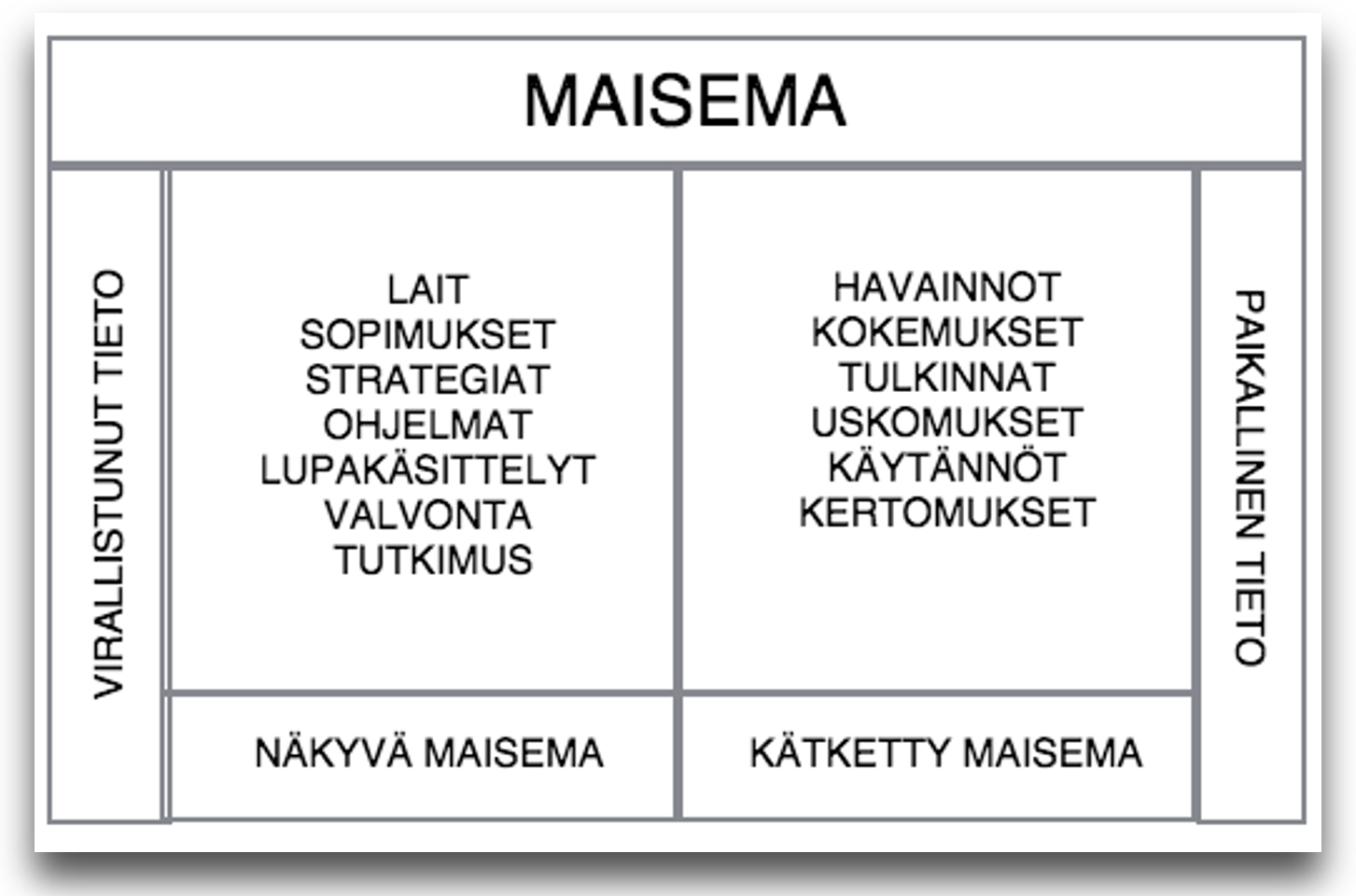Kätketty maisema syntyy arjessa. Se on omakohtainen, kokemuksiin pohjautuva ja tiiviisti arkeemme kietoutunut. Kätketty maisema on jatkuvassa muutoksessa, sillä maisemakäsitykseemme vaikuttavat kaikki saamamme kokemukset, tekemämme havainnot ja kartuttamamme tiedot. Kätkettyä maisemaa ei välttämättä avata muille, ellei siitä pyydetä kertomaan. Paikallinen tieto on moniäänistä, usein epämääräistä, paikalliseen kulttuuriin sitoutunutta ja yhteismitatonta. Tällä tavoin muodostunut tieto ei täytä virallistuneen tiedon normia tai totuudellisuuden arvioitavuuden vaatimusta, eikä se siihen pyritään. Paikallinen tieto vastaa tarpeeseemme asemoitua meitä ympäröivään maailmaan, ymmärtää sen toimintaa ja sopeutua siihen. Toisinaan kätketyn maiseman sisältämää paikallista tietoa kutsutaan mukaan näkyvän maiseman prosesseihin esimerkiksi osallistamistyössä, ei kuitenkaan johdonmukaisesti.