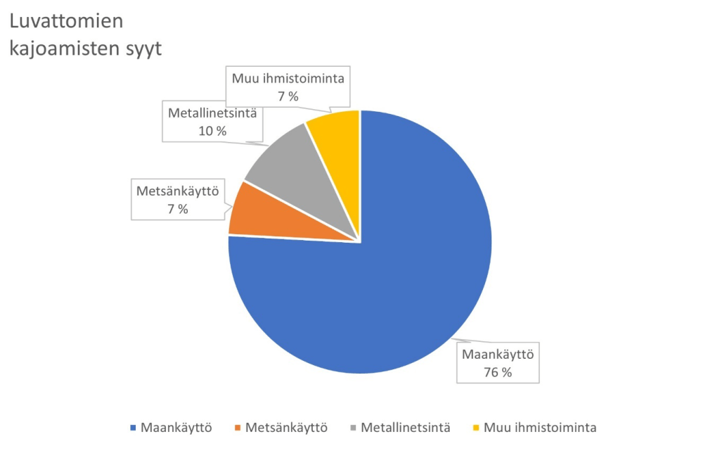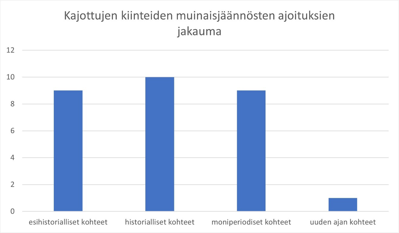 Tutkimusaineistostani selvisi, että vuosina 2010–2019 kiinteisiin muinaisjäännöksiin oli kajottu Pirkanmaan alueella yhteensä 29 kertaa. Luvattomat kajoamiset olivat tapahtuneet maan- ja metsänkäyttöhankkeiden ja muun vahingollisen ihmistoiminnan, kuten esimerkiksi harkitsemattoman metallinetsinnän seurauksena. Muinaismuistolain laiminlyöntiä oli tapahtunut kyseisellä aikavälillä niin yksittäisten yksityishenkilöiden kuin myös erilaisten suurempien ja yleisten toimijaryhmien, kuten yritysten ja kuntien edustajien toimesta. Kajoamistapauksista valtaosa eli 22 tapausta liittyi maankäyttöhankkeisiin, kolme kajoamista tapahtui metallinetsinnän seurauksena, kaksi tapausta metsänkäyttöön liittyvien hankkeiden seurauksena ja kaksi tapausta aiheutui muusta ihmisen toiminnasta.