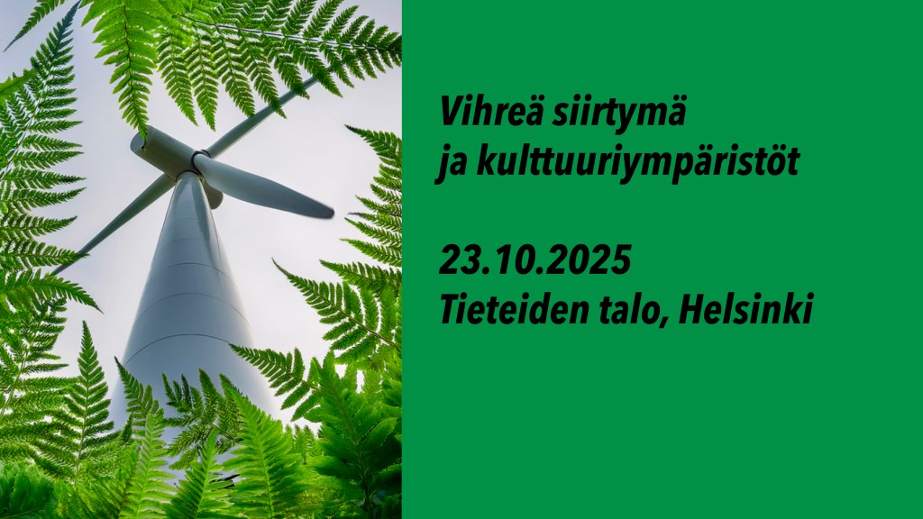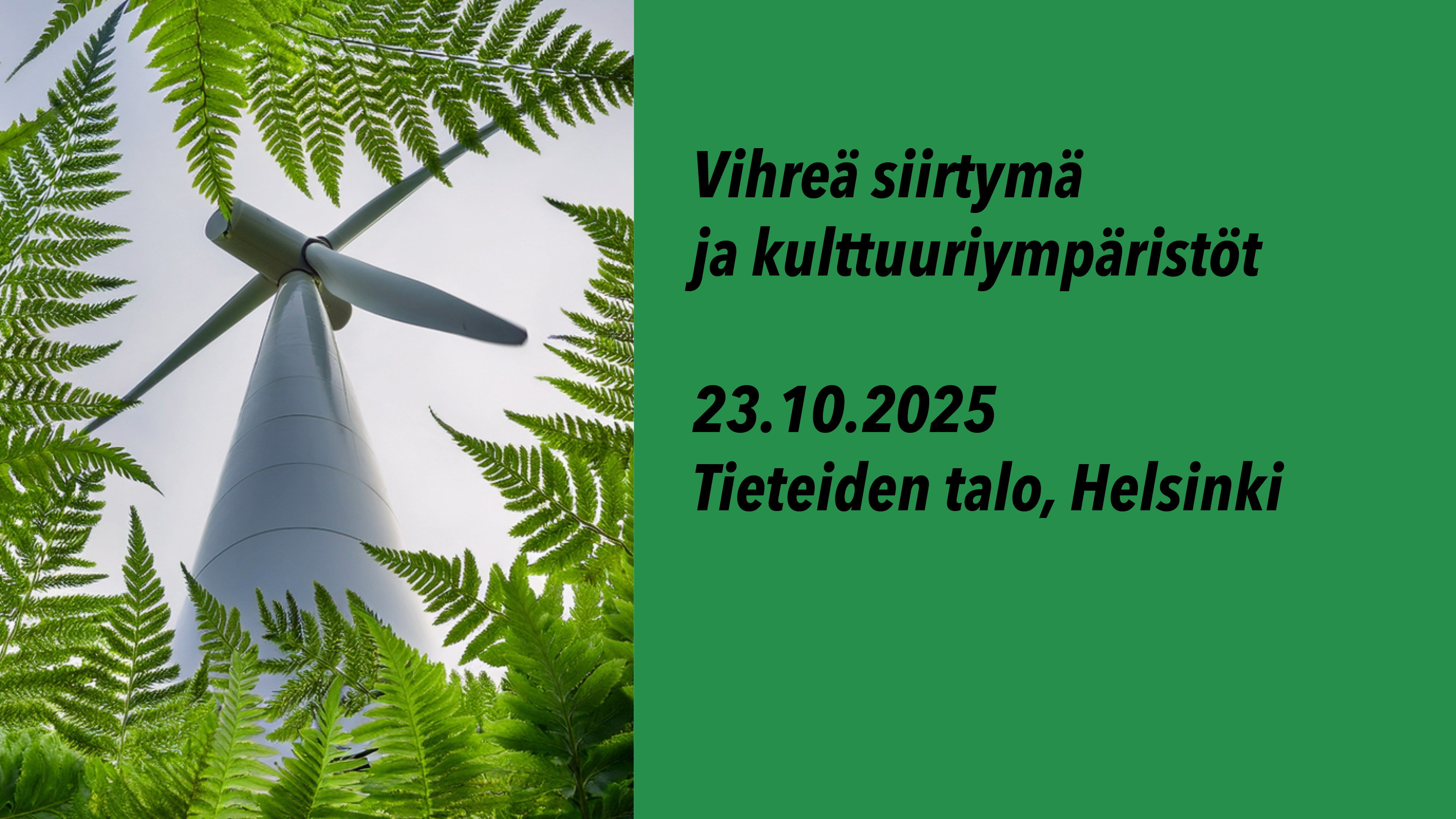 Kulttuuriympäristötutkimuksen seura ry järjestää 23. lokakuuta 2025 Tieteiden talossa seminaarin ”Vihreä siirtymä ja kulttuuriympäristöt”, jossa tarkastellaan uusien energiatuotannon muotojen vaikutuksia kulttuuriympäristöihin.
